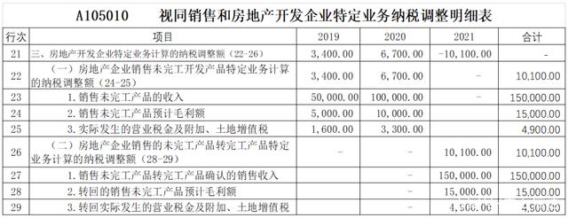 项目于2020年12月竣备并交房,当年会计结转售房收入150,000万元,结转税金附加4900万元;2021年度结转售房收入20000万元,结转税金附加700万元。当地预计毛利率为10%,假设项目实际毛利率为18%(成本均有合规票据),则2019、2020、2021年度利润表及A105010表预计毛利额可分别填写如下: